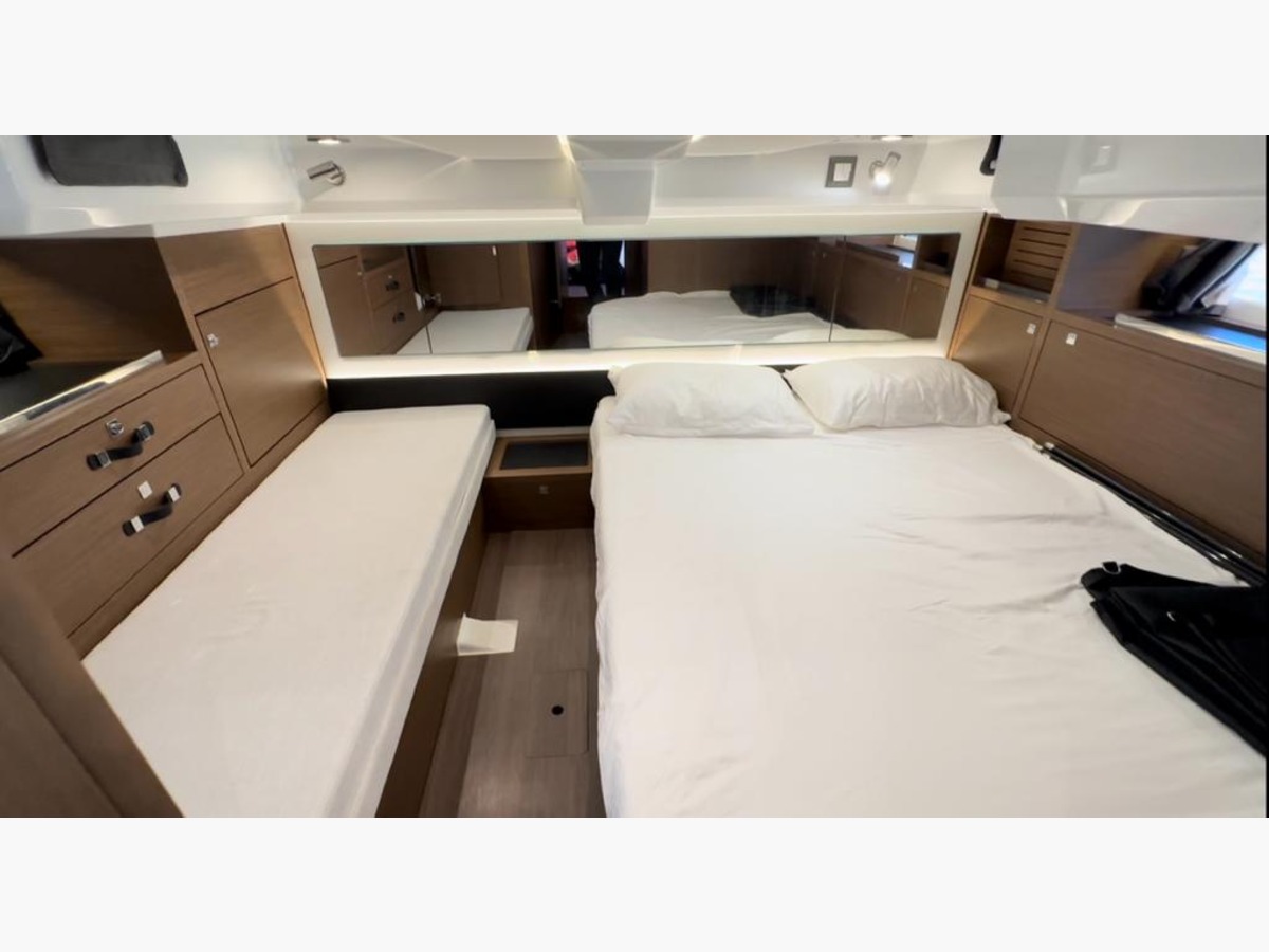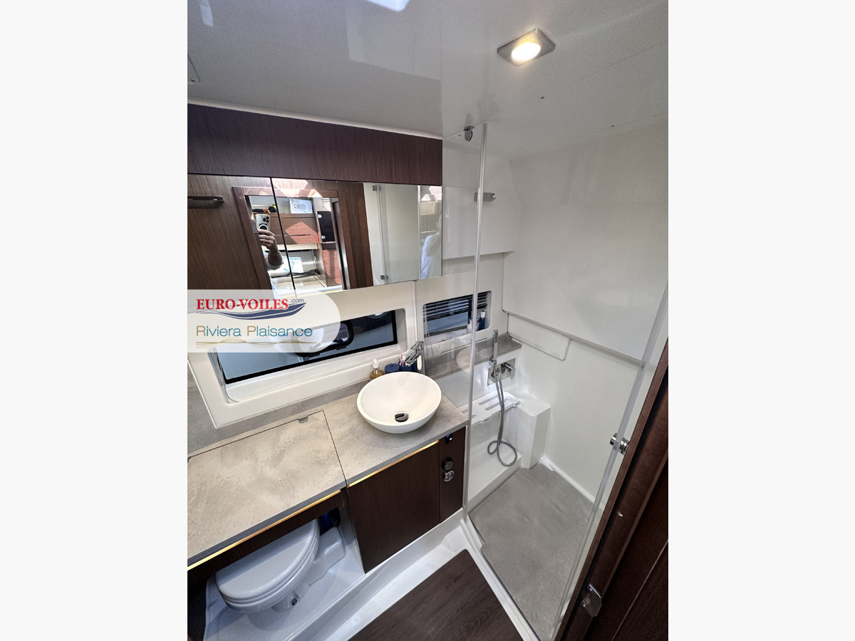 L’intérieur n’est pas en reste, avec une véritable cabine propriétaire avec lit king-size, sofa, vue mer, une belle salle d’eau et une cabine invités indépendante. La cuisine intérieure équipée offre tout le nécessaire pour profiter de croisières confortables.