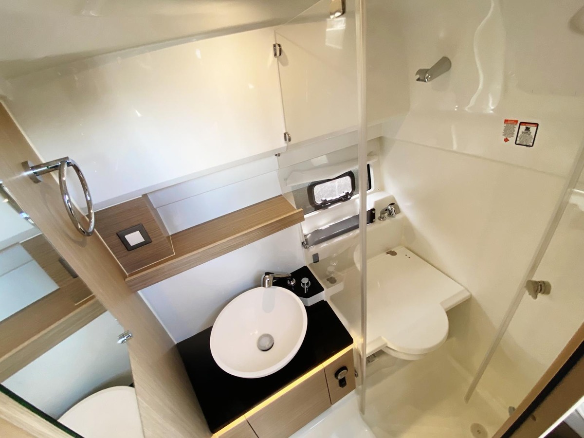 Bain de soleil transformant le cockpit arrière, accès facile et sécurisé à la mer, terrasse latérale. Profitez d'un véritable cockpit supplémentaire à l'avant pour vous détendre avec une chaise longue ou un bain de soleil, suivi d'une cuisine extérieure et de deux cabines doubles accueillantes.