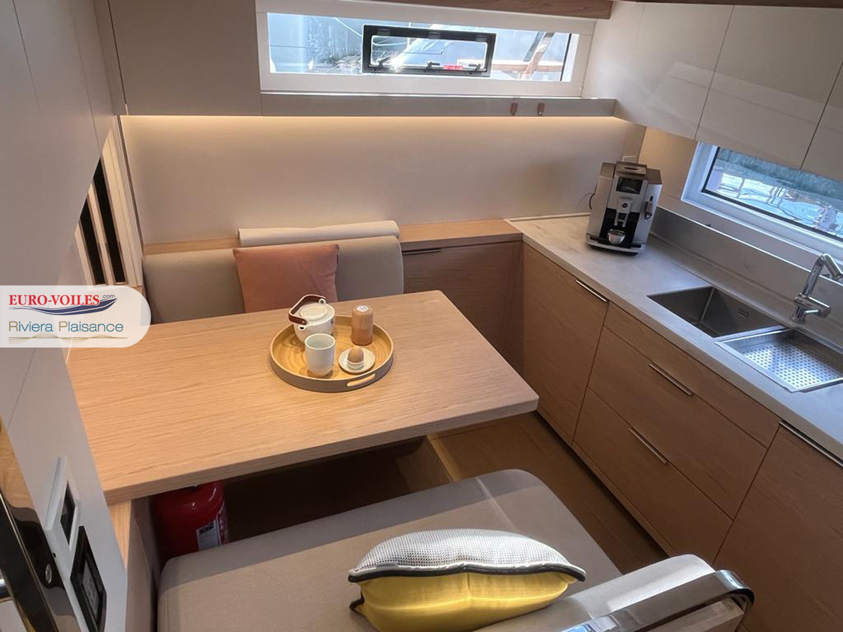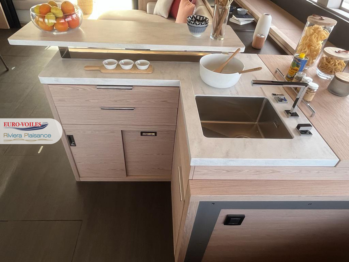 À bord, liberté, luxe, confort et style sont parfaitement combinés. Vous retrouverez également de nombreuses options permettant de naviguer sur un bateau made in France aux qualités de construction remarquables. Ce catamaran à voiles est extrêmement bien équipé et élégant.