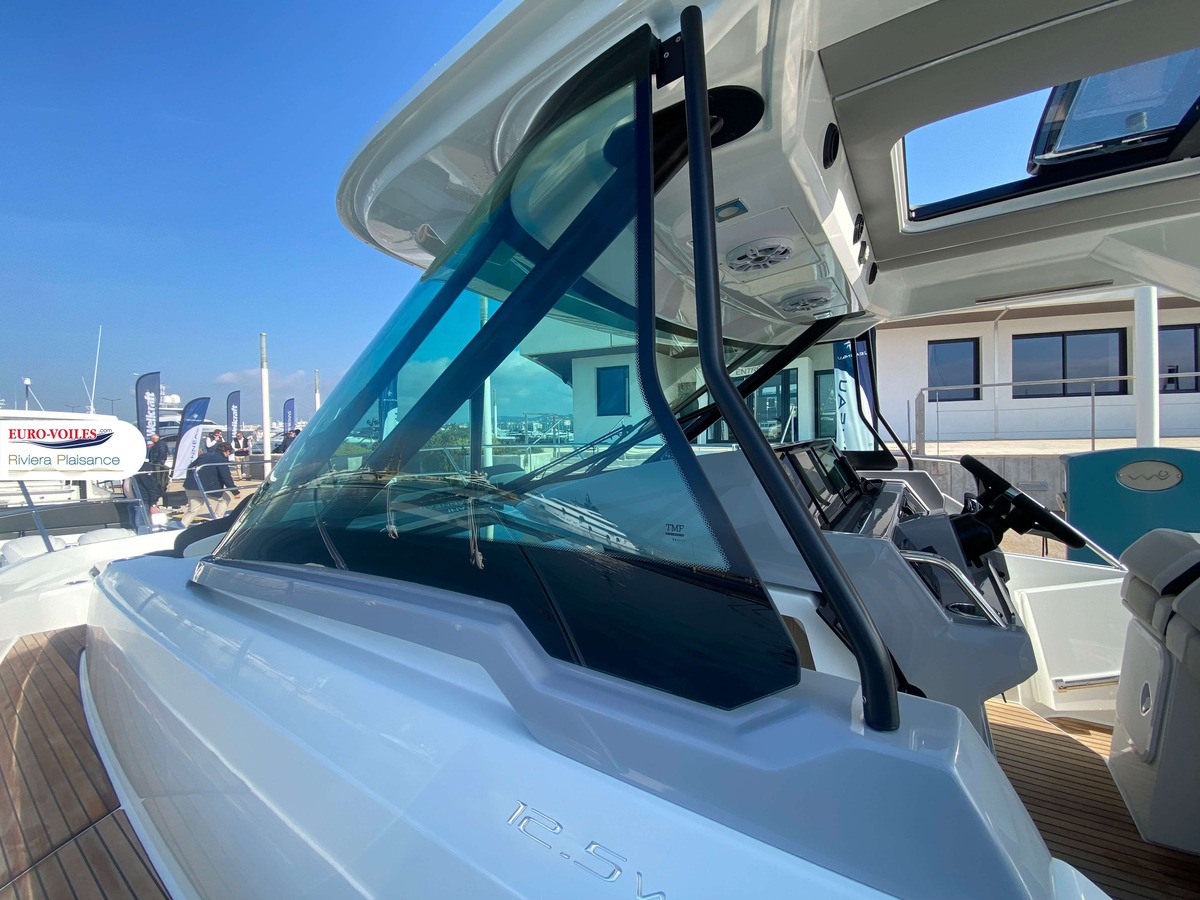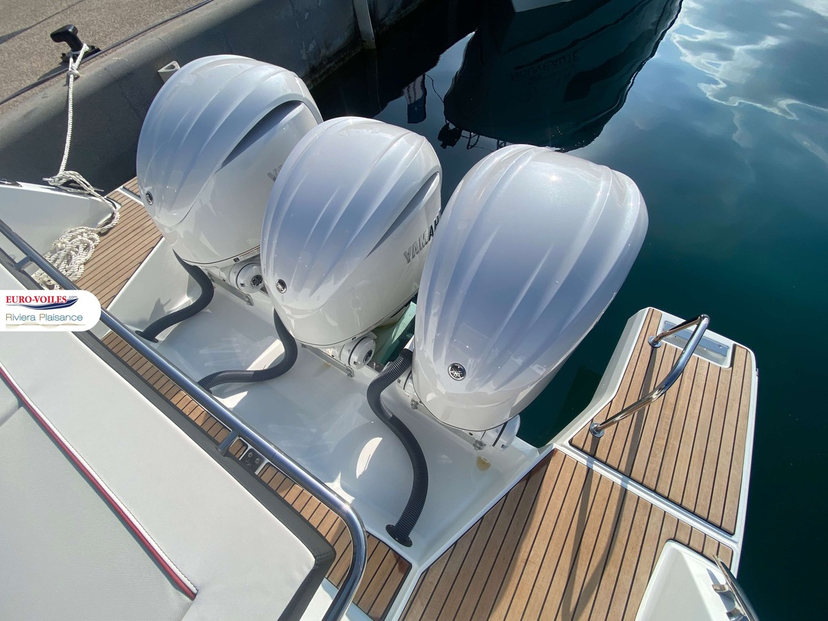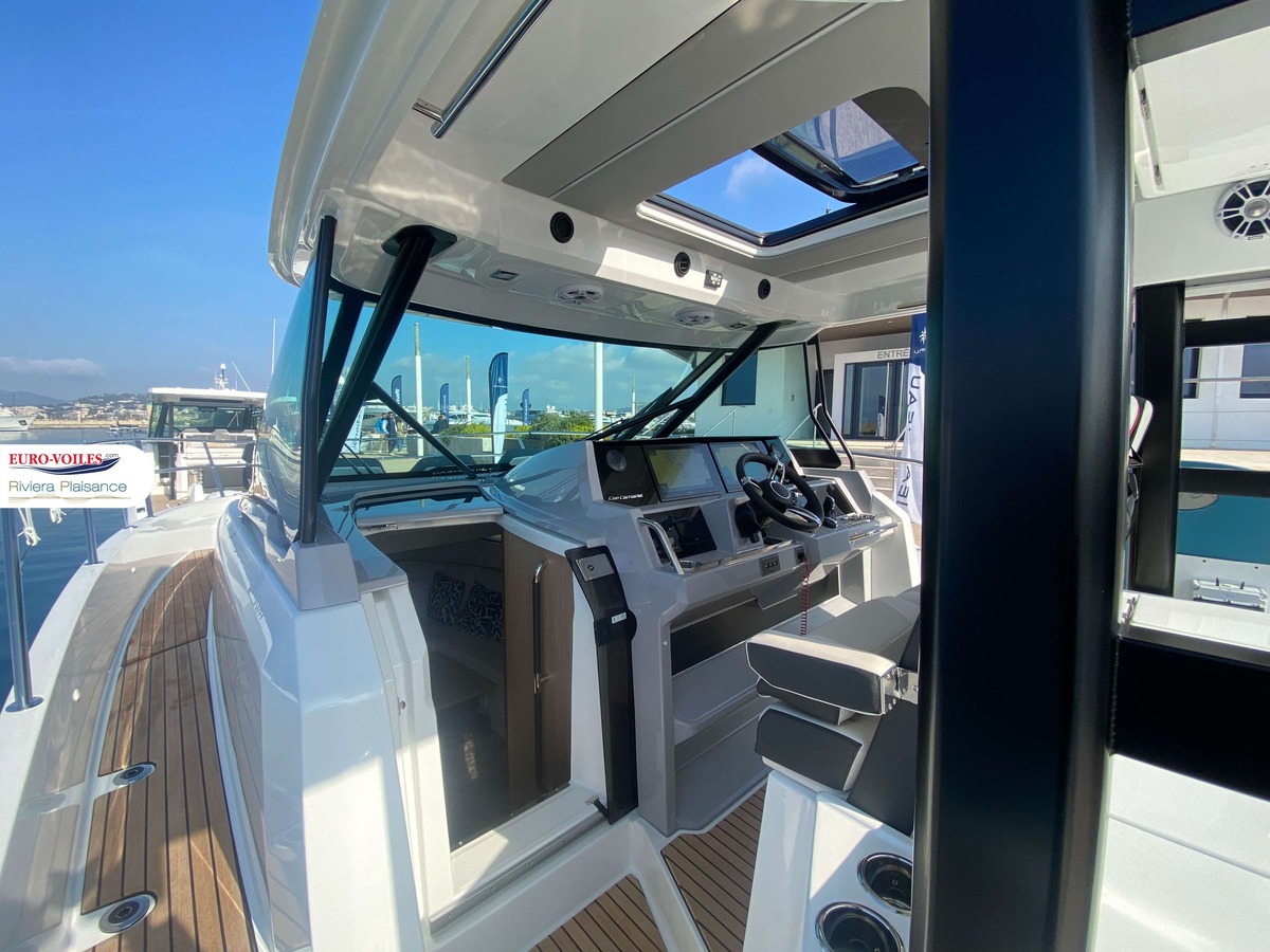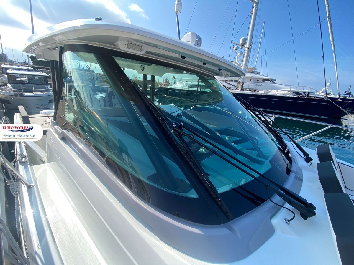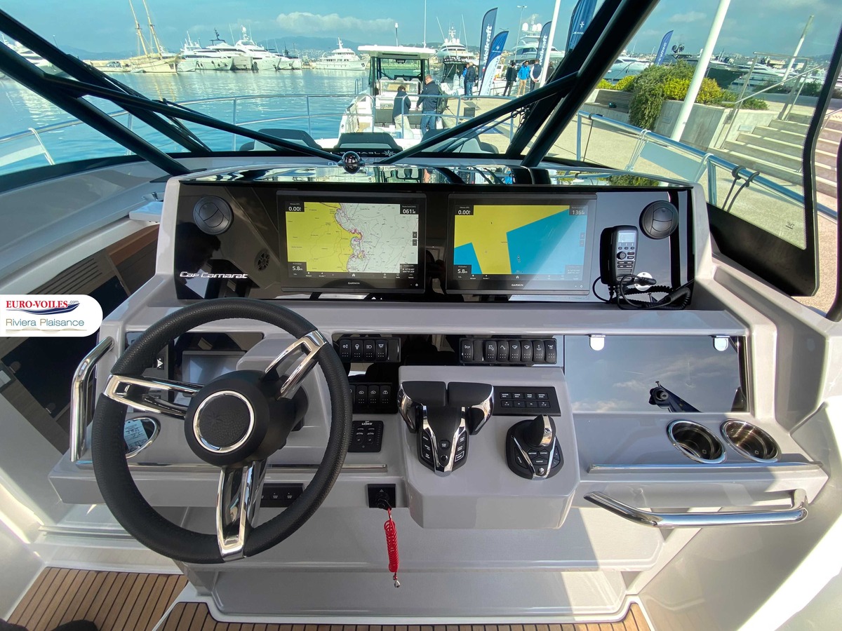 Now equipped with a high windshield, offering the perfect balance of protection and elegance. Discover its sporty T-Top and high-tech helm station, featuring dual Garmin screens for a seamless navigation experience.
