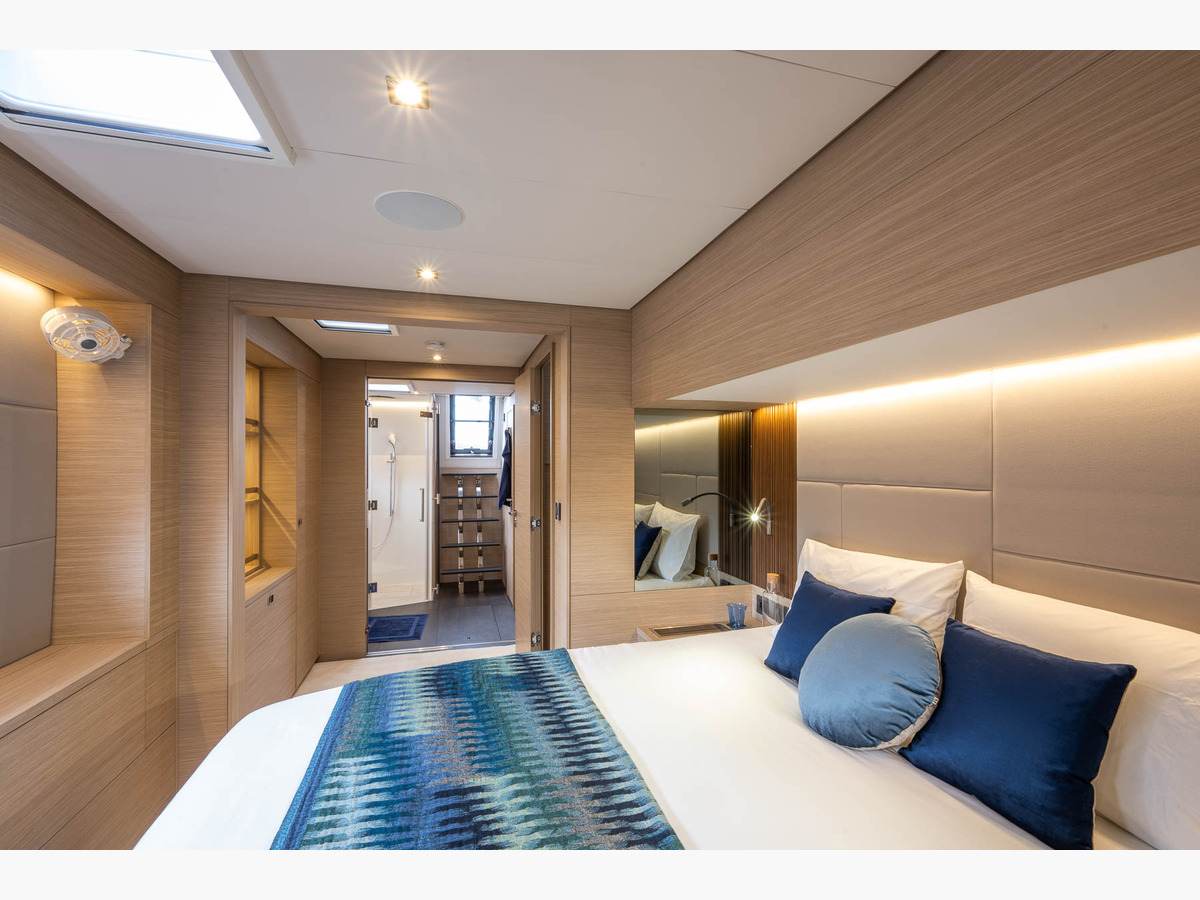 The Lagoon 60 is a true marvel that will take you to unexplored horizons, offering exceptional features for an unparalleled experience at sea. Its "Beach Club" cockpit is an exceptional space of freedom where you can relax and enjoy the panorama. Imagine yourself soaking up the sun, with your feet in the water and direct access to the swimming area. A unique place to relax.